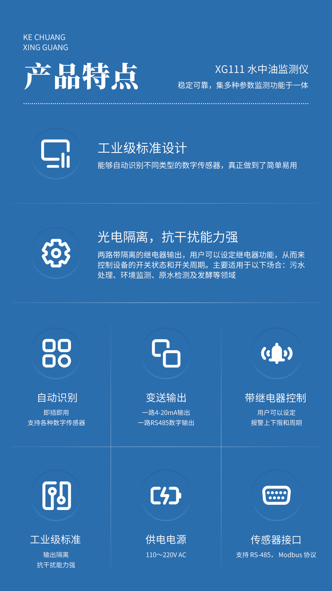XG111 在線(xiàn)水中油監(jiān)測(cè)儀 采用工業(yè)級(jí)標(biāo)準(zhǔn)設(shè)計(jì),穩(wěn)定可靠,集多種參數(shù)監(jiān)測(cè)功能于一體,該設(shè)備能夠自動(dòng)識(shí)別不同類(lèi)型的數(shù)字傳感器,真正做到了簡(jiǎn)單易用。該設(shè)備支持一路 RS485 輸出,一路 4-20mA 輸出,光電隔離,抗干擾能力強(qiáng)。兩路帶隔離的繼電器輸出,用戶(hù)可以設(shè)定繼電器功能,從而來(lái)控制設(shè)備的開(kāi)關(guān)狀態(tài)和開(kāi)關(guān)周期。主要適用于以下場(chǎng)合:污水處理、環(huán)境監(jiān)測(cè)、原水檢測(cè)及發(fā)酵等領(lǐng)域。