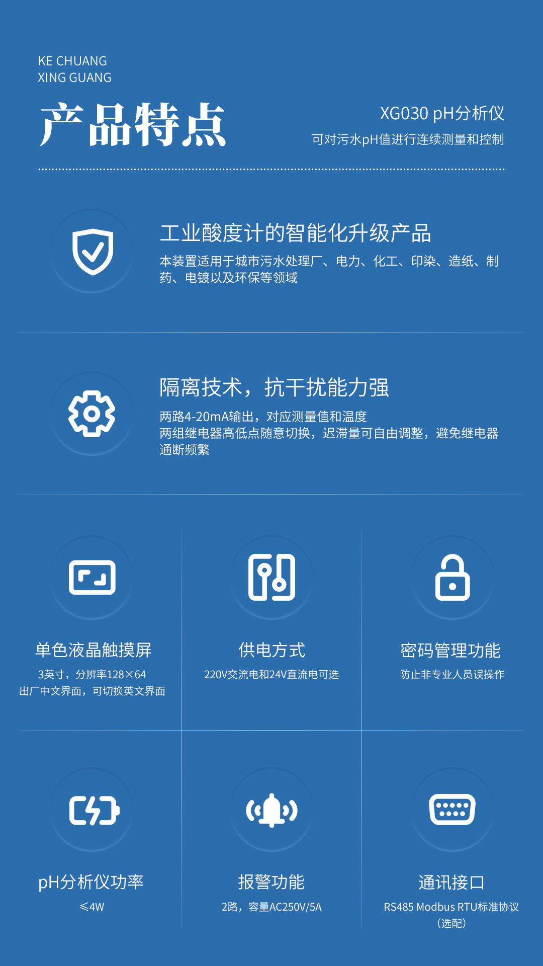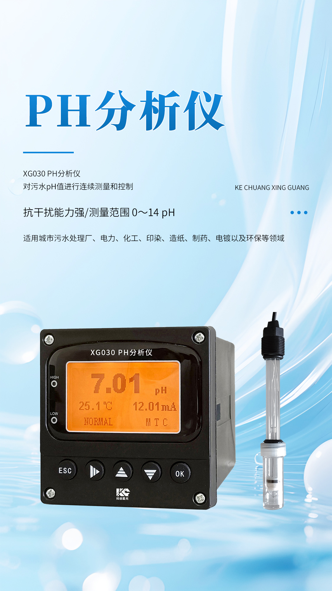 XG030 PH分析儀 是工業(yè)酸度計(jì)的智能化升級(jí)產(chǎn)品,可對(duì)污水pH值進(jìn)行連續(xù)測(cè)量和控制,本裝置適用于城市污水處理廠、電力、化工、印染、造紙、制藥、電鍍以及環(huán)保等領(lǐng)域。