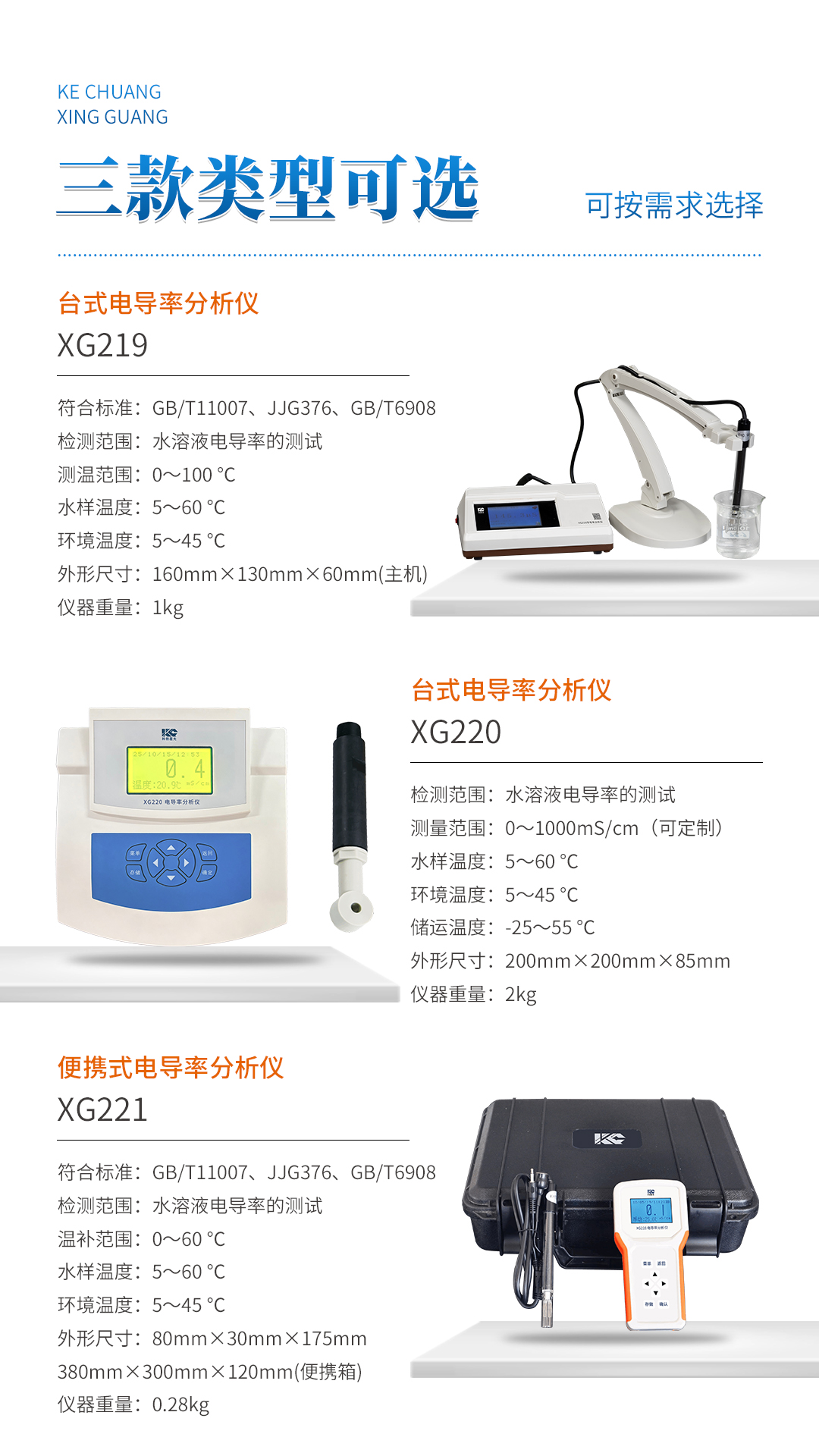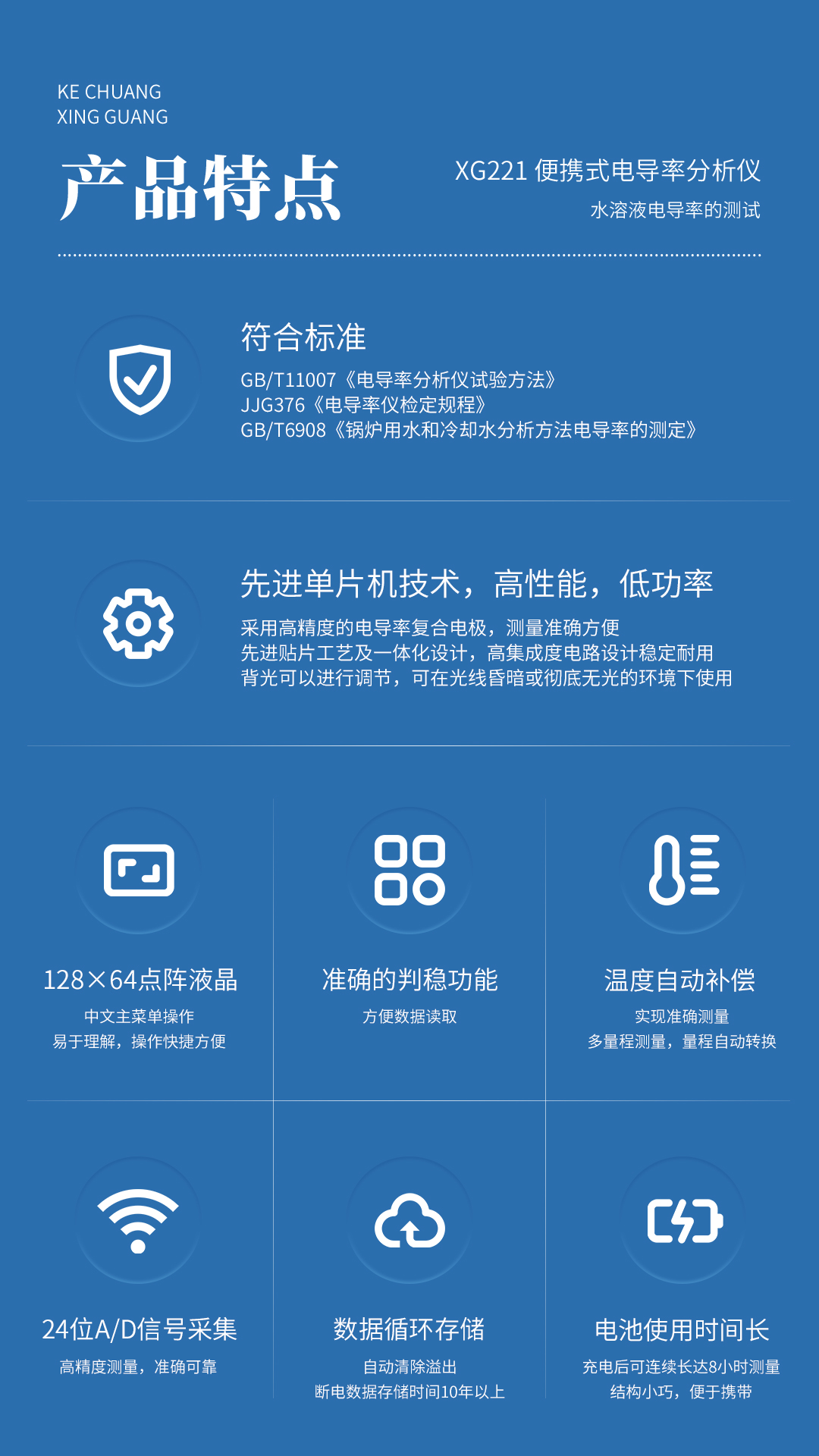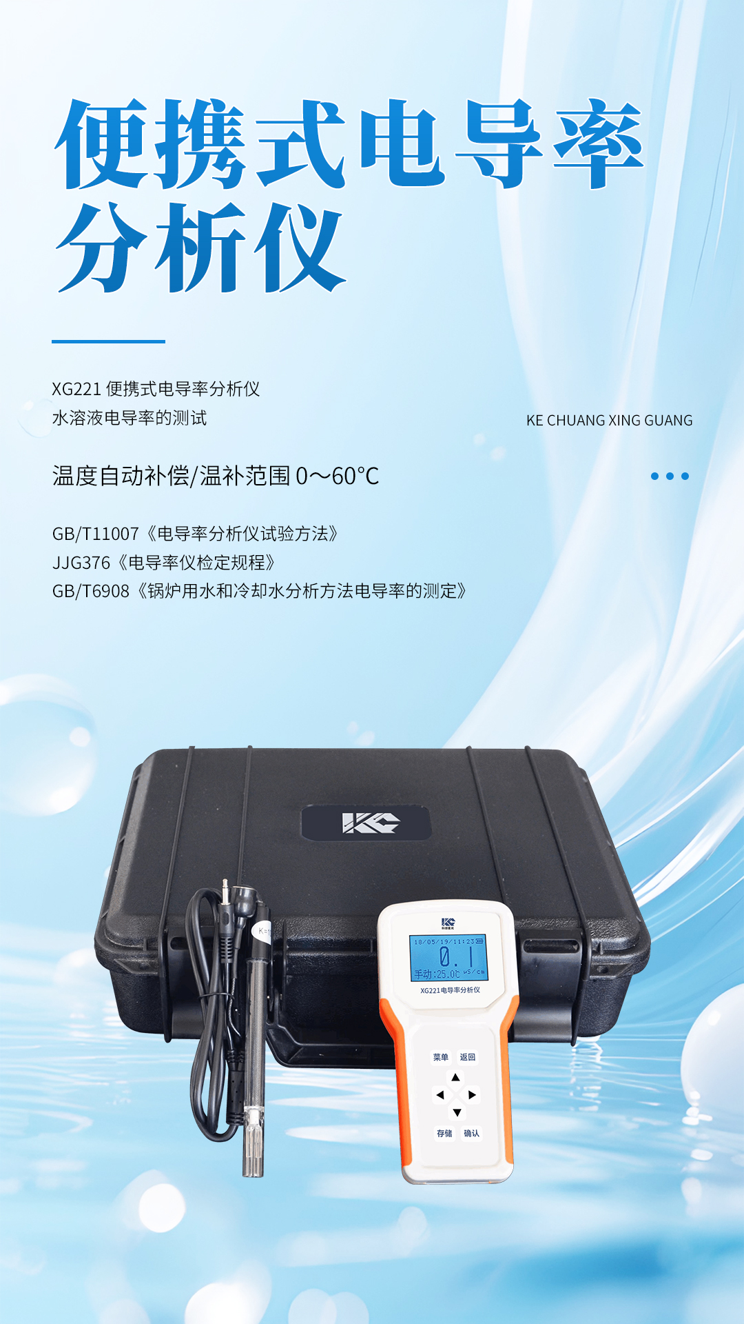 XG221 便攜式電導率分析儀 依據(jù)GB/T11007《電導率分析儀試驗方法》和JJG376《電導率儀檢定規(guī)程》標準設計制造。適用于GB/T6908《鍋爐用水和冷卻水分析方法電導率的測定》,應用于火電、化工、冶金、環(huán)保、制藥、生化、食品和自來水等行業(yè)水溶液電導率的測試。